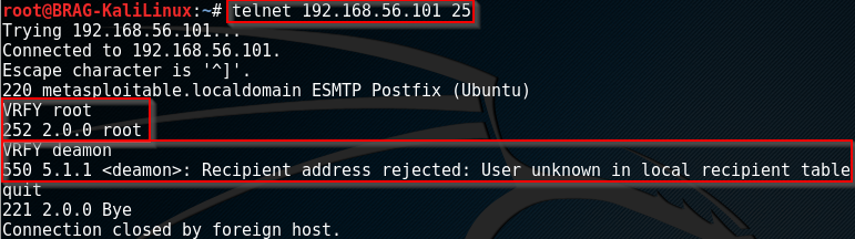 SMTP can help the penetration tester to perform username enumeration via the EXPNand VRFYcommands if these commands have not been disabled by the system administrator. The role of the EXPNcommand is to reveal the actual address of users aliases and lists of email and VRFYwhich can confirm the existance of names of valid users.